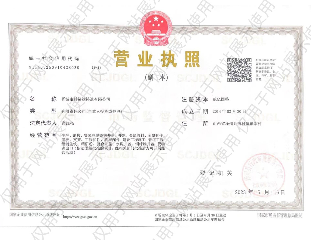晉城市科裕達鑄造有限公司,位于山西省晉城市南村鎮智能綠色鑄造創新產業園區,成立于2014年2月,注冊資金2億元整,產量10萬噸。經過這些來的發展,已經成為全國集研發、生產、銷售各類球墨鑄鐵井蓋、箅子產品于一體的專業鑄造公司,是已知國內較大的球墨鑄鐵井蓋生產基地。2016年10月,公司順利通過了二級安全生產標準化的評審,正式成為一家二級安全生產標準化企業。2017年3月,山西省安全生產監督管理局授予公司2016年冶金工貿行業“安全生產先進單位”稱號。2017年11月被山西省中小企業局授予“專精特新”中小企業榮譽。2020年8月被認定為國家高新技術企業。2021年5月被中國鑄造協會認定為“單項冠軍企業”。2021年9月被山西省中小企業局授予“專精特新小巨人”企業榮譽。2022年被中國鑄造協會認定為第四屆鑄造行業排頭兵企業。2023年7月被工信部認定為“國家級專精特新小巨人”企業榮譽。2024年被省工信廳認定有“省級綠色工廠”及“省級企業技術中心”。